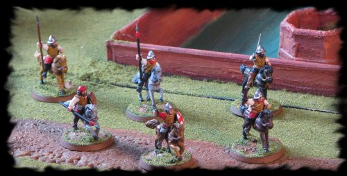 English Light Horse gallop across the front of the Hall. These figures are all from the vey excellent VENDEL. there has been the odd arm or hand conversion with some non vendel weapons added.