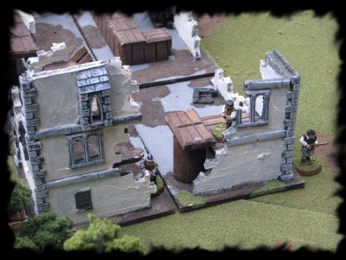 militia men take up positions in the ruined inn. |