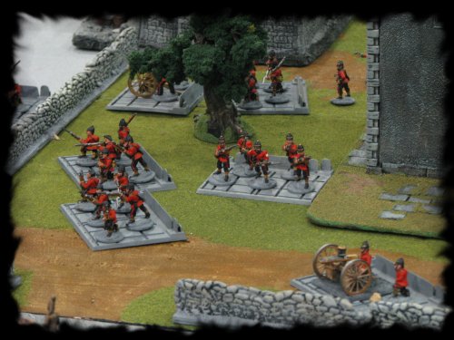 Redcoated British Infantry take up positions. They were pretty good. Some players deployed very well, the Gatling Gun placed on the church tower was devastating.