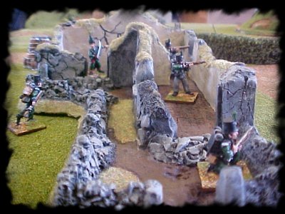 Scenario 2 Forward Picket The Riflemen take up their positions ready to fight off the approaching Frenchies. The walls of the farmhouse made an excellent defence, in our game only one Rifleman was hit by enemy shooting. (Click on the image to return to the full scenario) If you have any comments, suggestions or just want to tell us what decent chaps we are please email us email: Voltigeur@SOTG |