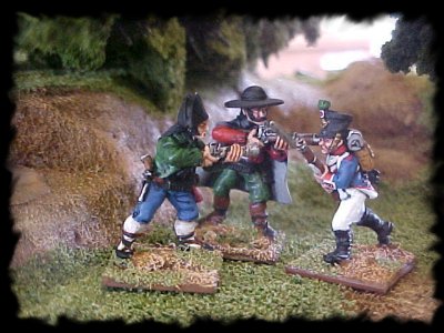 Scenario 2 Forward Picket The guerrillas take revenge. The two Spaniards assisted the Rifles by turning round and moving on the French flank. They met this unfortunate infantry man in the wooded hill to the east of the road. There was a brutal fight which lasted several turns but eventually the hapless Frenchman fell to their blades. (Click on the image to return to the full scenario) If you have any comments, suggestions or just want to tell us what decent chaps we are please email us email: Voltigeur@SOTG |
