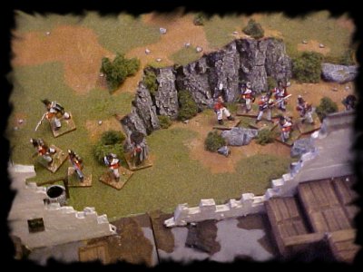 The British approach the rear of the inn. Corporal Larkins' section engages the advancing voltigeurs, Lt Denbeigh's men go for the inn. (Click on the image to return to the full scenario) If you have any comments, suggestions or just want to tell us what decent chaps we are please email us email: Voltigeur@SOTG |