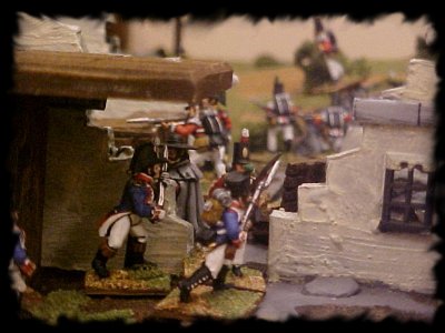 Pte Jenkins and a Guido, a Spaniard attempt to stop the French getting into the inn. All they could do was hold up the French for a short time giving Pte Watkins the opportunity to get out of the building. Both men were cut down by sword and bayonet. (Click on the image to return to the full scenario) If you have any comments, suggestions or just want to tell us what decent chaps we are please email us email: Voltigeur@SOTG |
