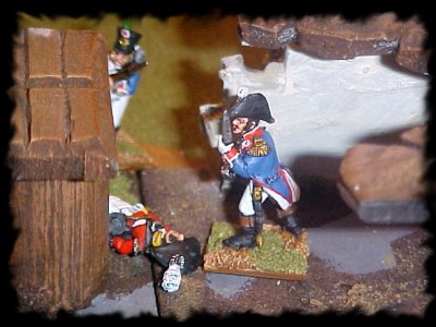 Lt Denbeigh entered the inn to cover Watkins' exit. He was first attacked by two French troops. Privates Tableaux and Plateaux. he despatched both men with his sword. Having watched the slaughter, Lt Chirac was reluctant to fight Denbeigh, however Denbeigh charged him and they fought one to one. Denbeigh's luck, unfortunately ran out, with a mighty effort Chirac bested his opponent. (Click on the image to return to the full scenario) If you have any comments, suggestions or just want to tell us what decent chaps we are please email us email: Voltigeur@SOTG |