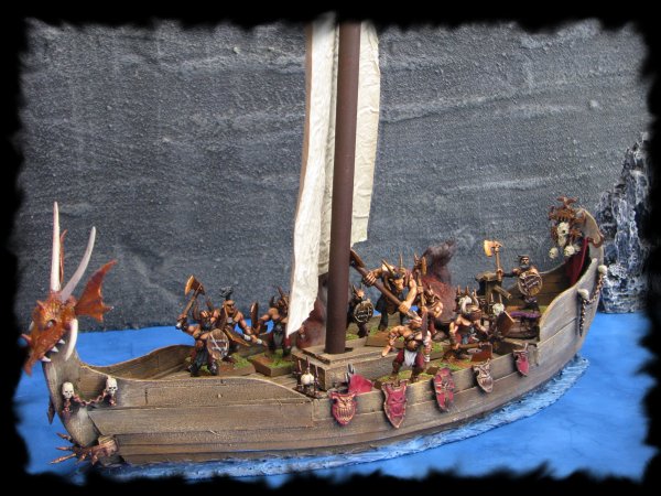 Blood drinker, a Medium sized Dragon Ship. This ship is dedicated to Khorne. Scratch built from foam core and balsa by Tim, The crew were painted by Dan Tunbridge.