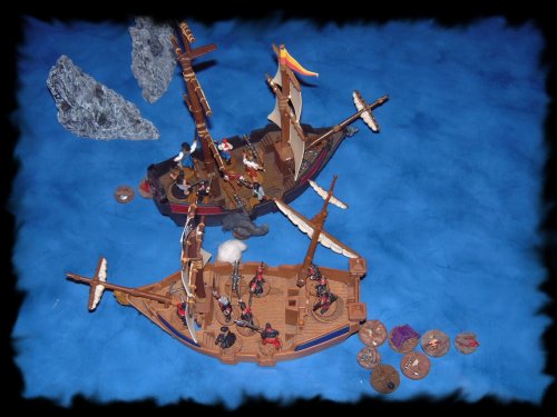 The Wolf and the Siren fire broadsides in open water. Note the damage counters 'floating' behind the ships to indicate the damage taken. The Siren in particular is looking in a bad way.