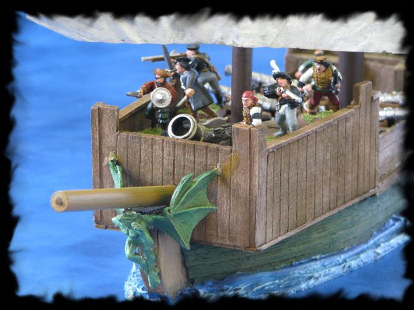 Close up detail of the Harpy's bow, figure head and mortar. The crew are Empire Militia figures.