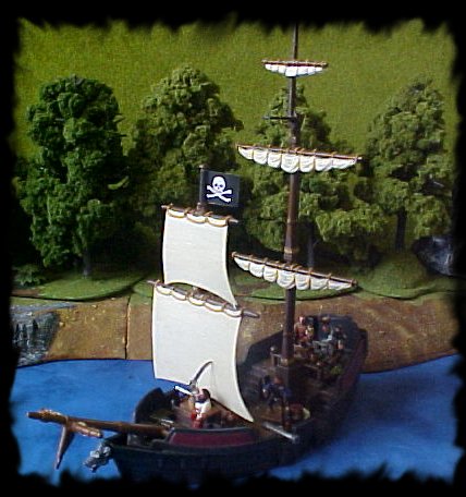 The Wolf, a small Empire vessel. This ship is often a pirate vessel. Here she is crewed by the Pirates led by the Fearsome OGRE. Her figure head is an Wolf's Head